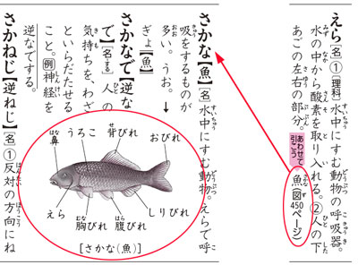 「魚」を引くと、そこには魚の体を解説した図がのっています。