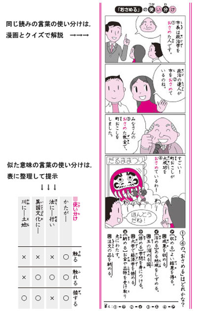 「収める・治める・修める・納める」や「公演・後援・講演」のような、同じ読みで意味の異なる言葉の使い分けを漫画で解説しています。